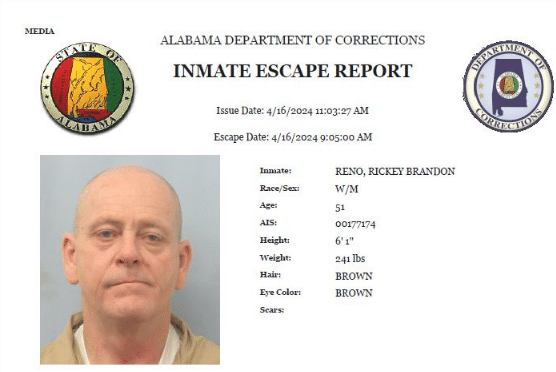 Details: Inmate Reno, Rickey Brandon, AIS# 177174, escaped from Hamilton Work Release at approximately 9:05AM on 04/16/2024. Hamilton Work Release is located in Hamilton, AL in Marion County.