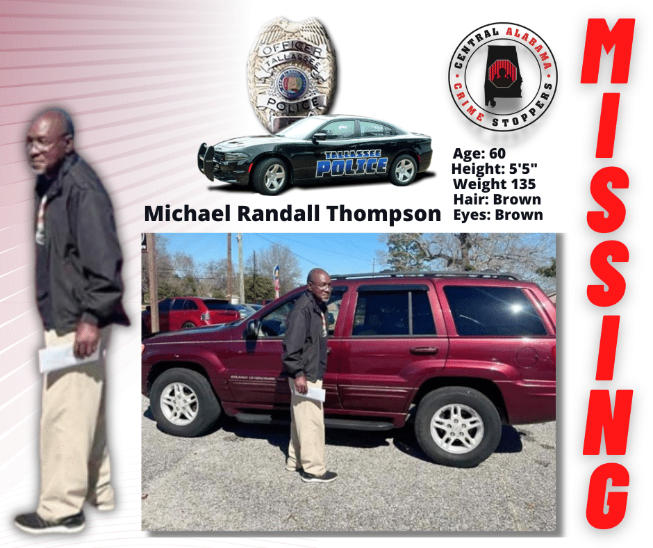 The Tallassee Police Department is searching for a missing elderly man, Micheal Randall Thompson, 60 of Tallassee, Alabama.