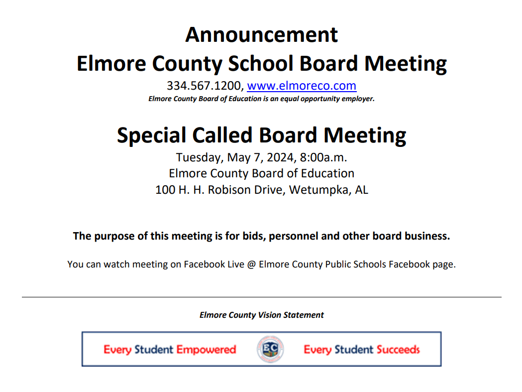 Special Called Board meeting for Elmore County is May 7