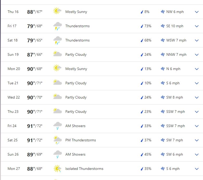 Scattered thunderstorms in the morning, then mainly cloudy during the afternoon with thunderstorms likely. Potential for heavy rainfall. High 79F. Winds SE at 5 to 10 mph. Chance of rain 70%.