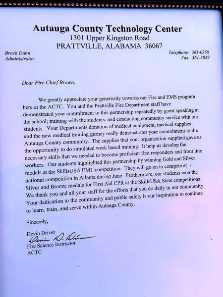 Yesterday we received a visit from Mr. Devin Driver and two high achieving students of the Fire Science program at the Autauga County Technology Center. The group presented Fire Chief Brown with a letter of gratitude for the donated equipment and supplies to the program.