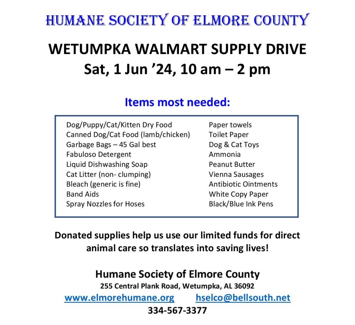 This coming Saturday, you can help out the Humane Society of Elmore County with a supply drive for the shelter.