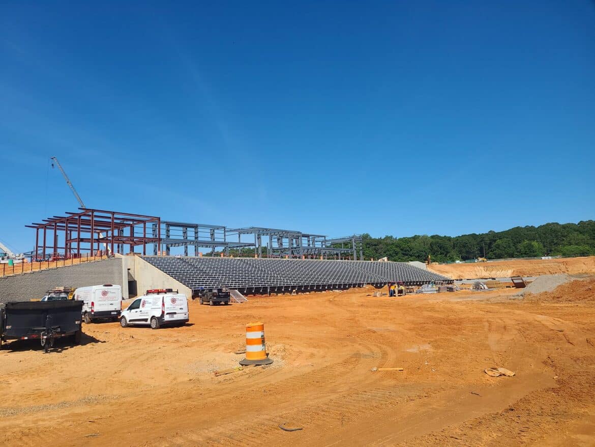 The beams of the field house are going vertical and now seen from Hwy. 14.