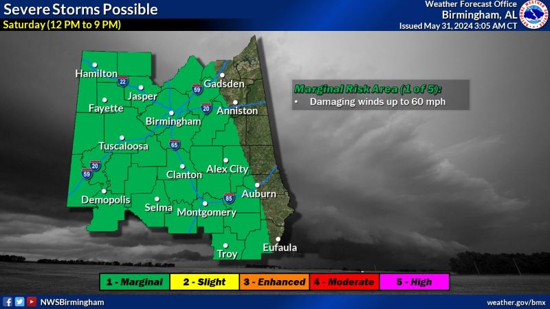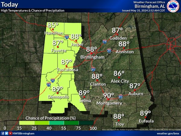 A slight chance of showers, then a chance of showers and thunderstorms after 10am, severe storms possible. Some of the storms could produce heavy rainfall. Mostly cloudy, with a high near 83. Southeast wind 10 to 15 mph. Chance of precipitation is 50%. New rainfall amounts between three quarters and one inch possible.