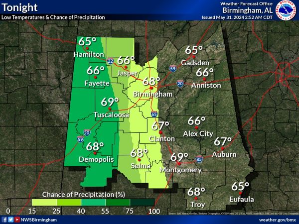 A 50 percent chance of showers and thunderstorms. Mostly cloudy, with a low around 67. South wind around 5 mph becoming calm in the evening.