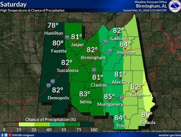 Showers and thunderstorms likely, mainly after 1pm. Partly sunny, with a high near 84. Southwest wind around 5 mph. Chance of precipitation is 60%.