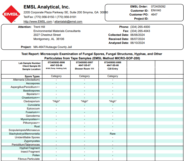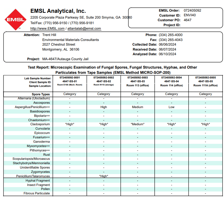 Multiple air samples and swab samples were taken throughout the structure and sent to a third-party lab in Pelham, Alabama to be analyzed.