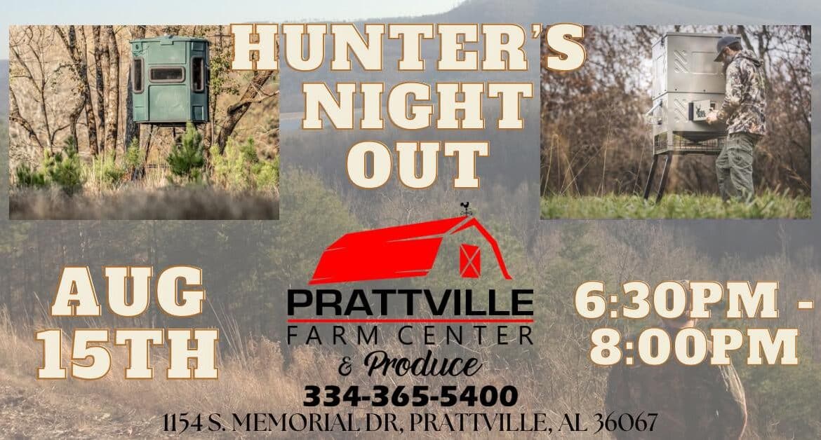 On Aug. 15 Prattville Farm Center will host a Hunter’s Night Out beginning at 6:30 p.m. There will be food trucks, vendors onsite and the public is invited to come out.