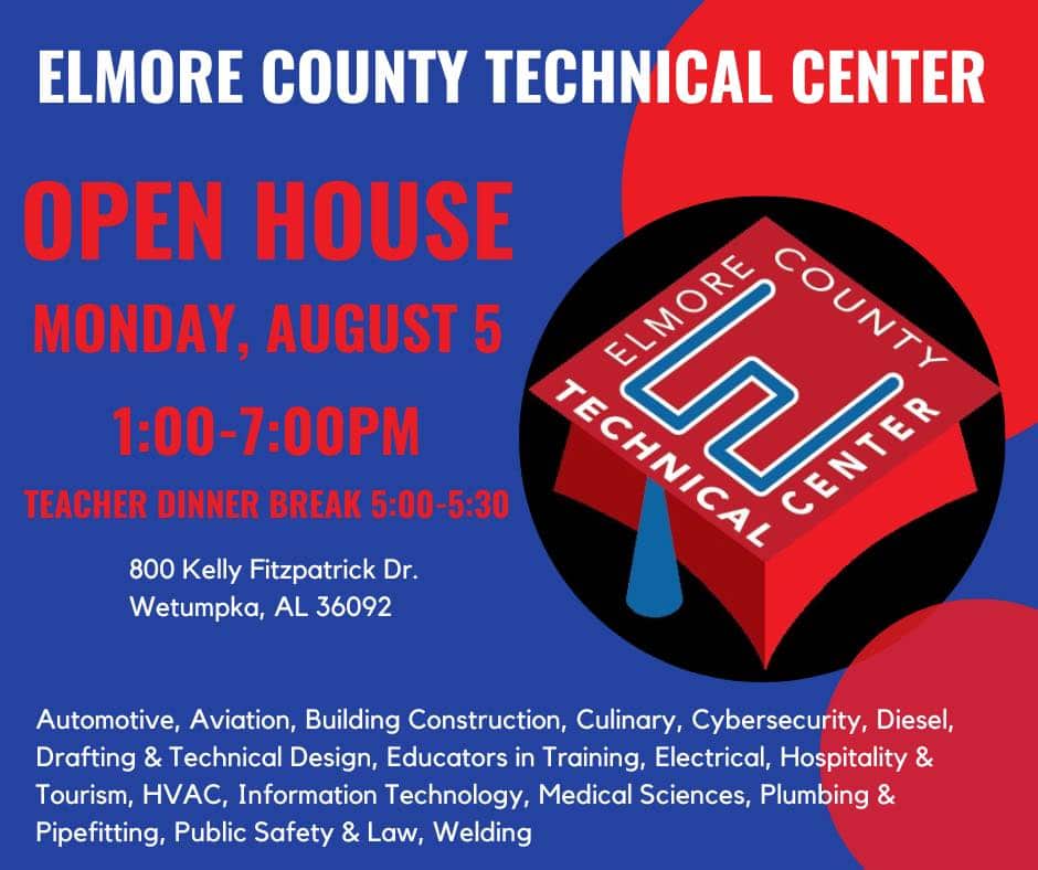 The Elmore County Technical Center will host an Open House event Monday, Aug. 5 from 1-7 p.m. The Center is located at 800 Kelly Fitzpatrick Drive in Wetumpka.