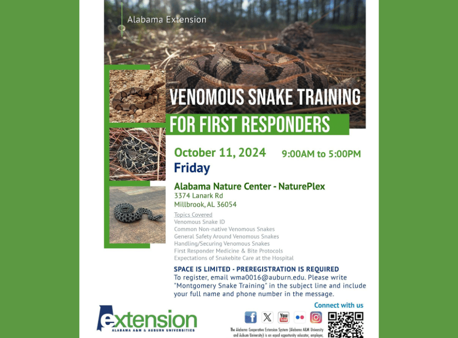 Register today to attend training being held on 10/11 from 9 AM- 5 PM at Lanark! Space is limited and preregistration is required. Email [email protected] and write ‘MONTGOMERY SNAKE TRAINING’ in the subject line to register. Include your full name and phone number in the body of the message.