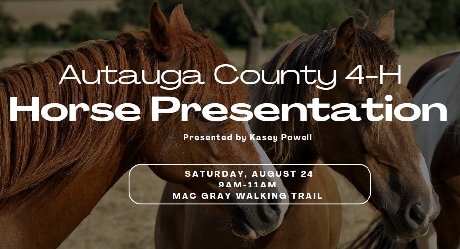 Do you have a passion for horses and want to learn more? Sign up for the Autauga County 4-H Horse Presentation on Saturday, August 24th. Don’t miss out on the funāspaces are limited! Call Prattville Parks and Recreation to register at 334-595-0800.
