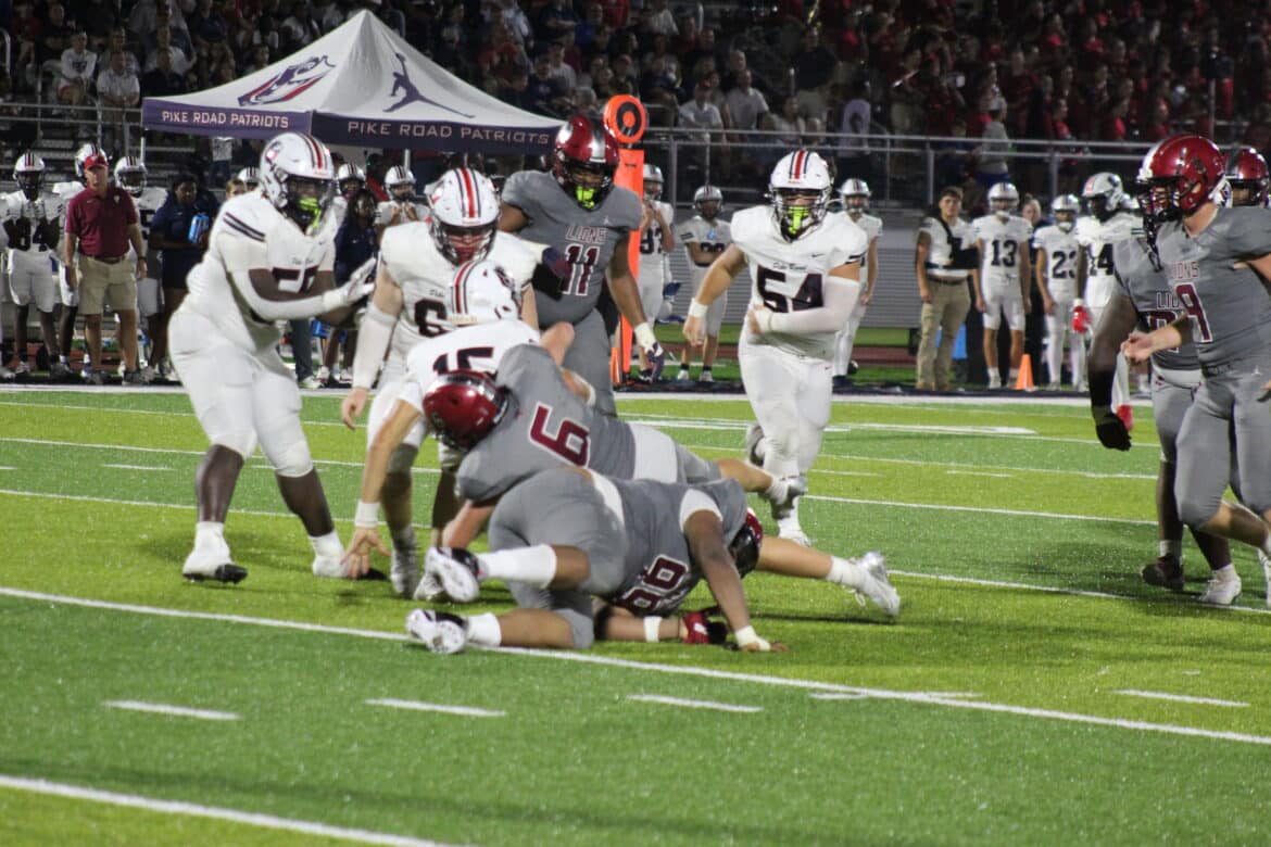 Clinging to a four-point lead early in the 4th quarter, Pike Road faced a 3rd and 23. They ran a draw and picked up 24 yards. On the next set of downs, the Patriots faced a 3rd and 9 and the quarterback ran for 10 yards. It looked like the Patriots were driving for a two-score lead, when they faced a 4th and 3 inside the Prattville 30-yard line. The Lions defense held, and got the ball back, but this time the Lions’ offense went three and out and punted the ball away. The ball bounced on the turf and hit a Pike Road player. The Lions recovered at midfield.