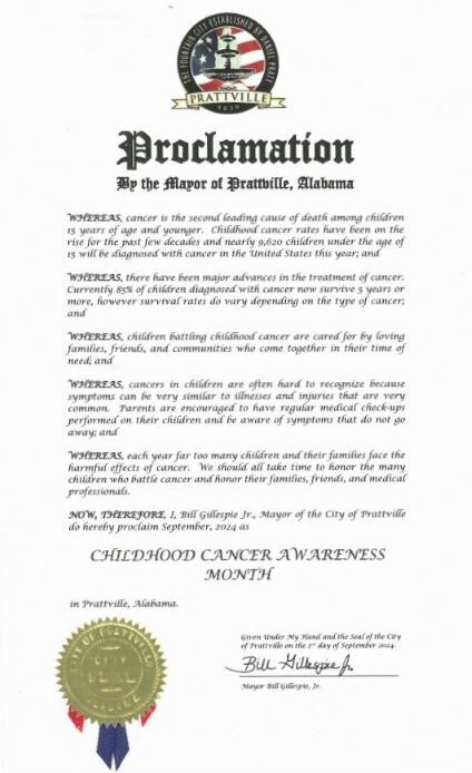 Mayor Gillespie proclaims September 2024 as Childhood Cancer Awareness Month in the City of Prattville. Let’s come together this month to raise awareness, support research, and stand with the brave kids and families fighting this battle.