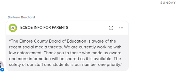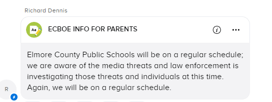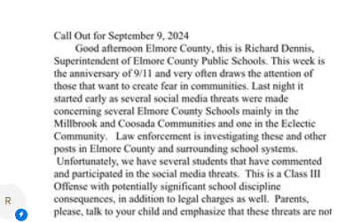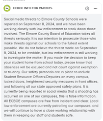 The Elmore County Leadership Team talked with law enforcement for an update Monday morning, September 9, 2024, and sent an updated statement to parents that morning at 9:38 AM.  That message was sent using the following communication tools: