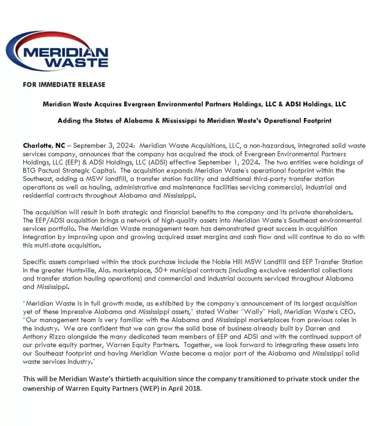 The Elmore County Commission was given notice that effective September 1, 2024, Arrow Disposal Services Inc. (ADSI) has merged with Meridian Waste. Customers can expect to see future communication from Meridian Waste instead of ADSI, but no other changes to the current Elmore County contract are expected at this time. The full press release from Meridian Waste is below.