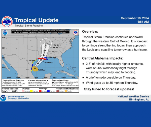 Rain: Because of Francine’s slow movement, there will a prolonged period of rain. A few bands could set up north to south and move consistently over the same areas. This will add to the rain totals already forecasted on the rainfall map, with a few areas possibly receiving over 6 inches today through tomorrow. Though central Alabama has been in a drought, these north to south bands could produce high enough rain totals to cause flooding.