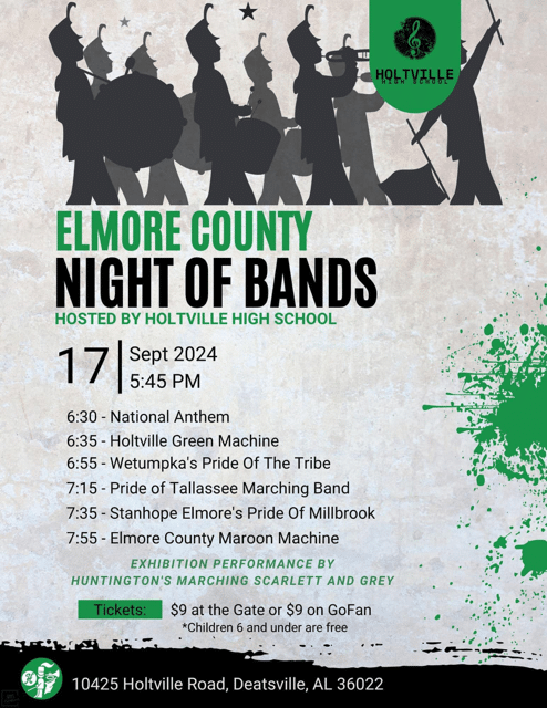 The Night of Bands brings together bands from several schools across the county, including Holtville High, Wetumpka High, Elmore County High, and Stanhope Elmore High. Each band will take the field to perform their halftime shows, featuring a mix of popular music, intricate formations, and the excitement of a traditional marching band spectacle.