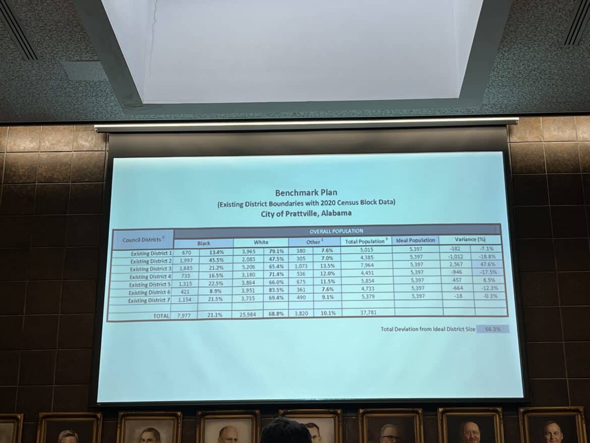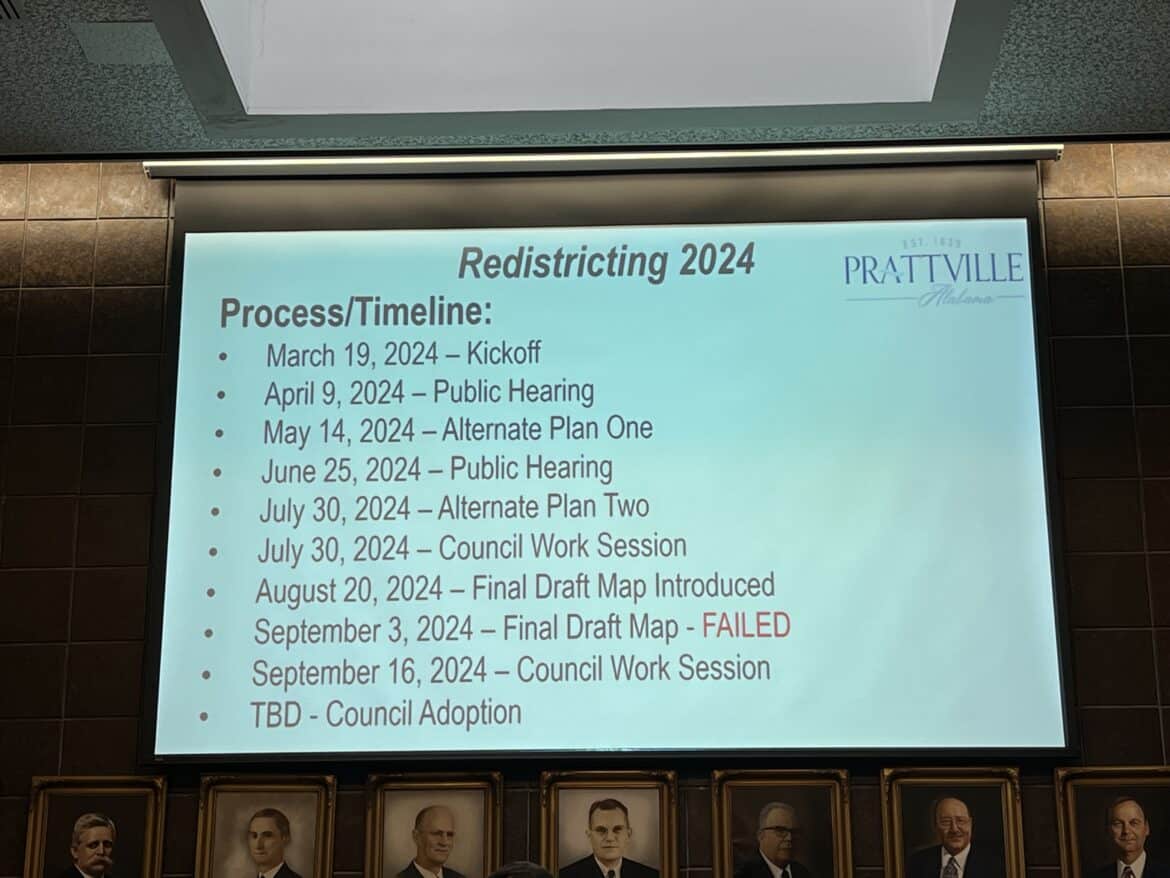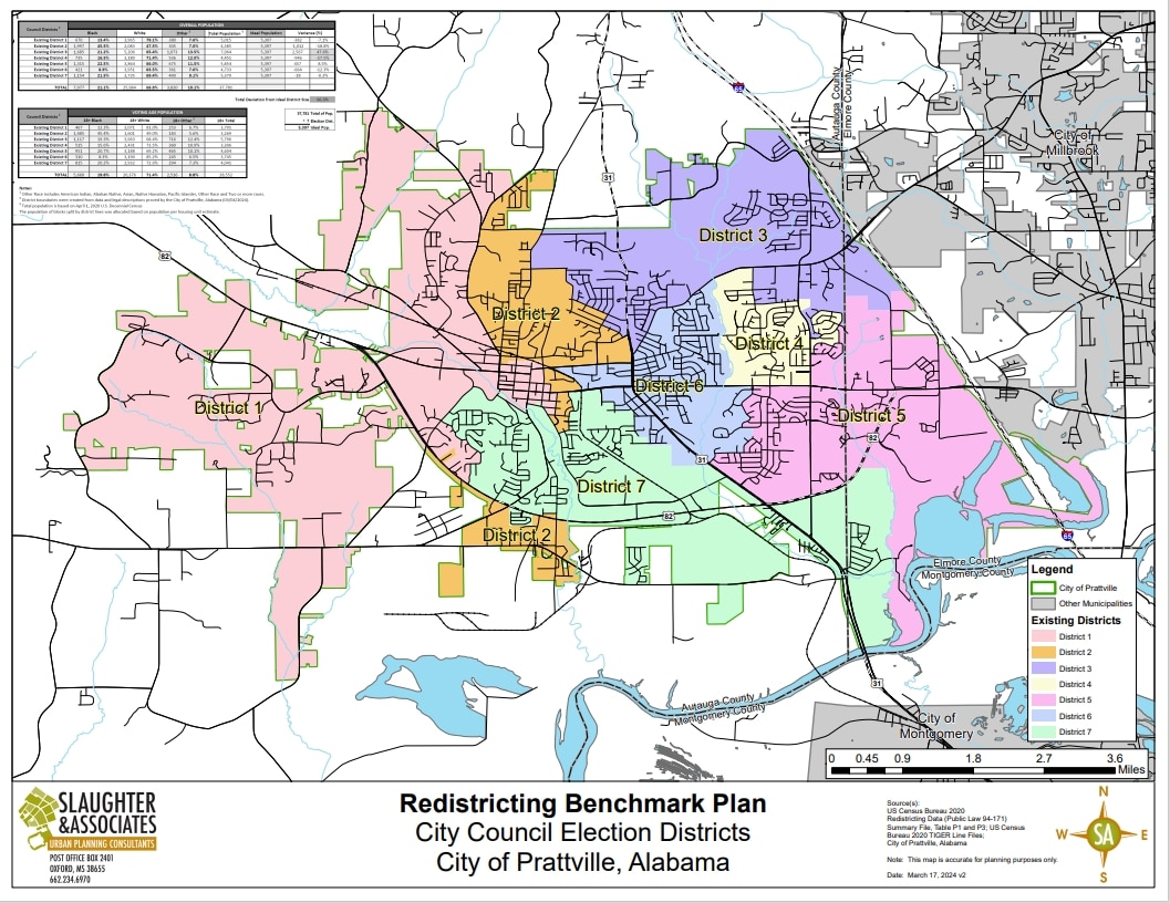 Currently there’s a benchmark plan in place with Slaughter and Willingham Associates Planning Firm for the new city council districts, using the 2020 census block numbers, input from the council members and the community that have either given input or sent in their own district maps. The Benchmark plan is publicly available online and can be found on the City of Prattville website or by clicking  https://prattvilleal.gov/redistricting-2024/.
