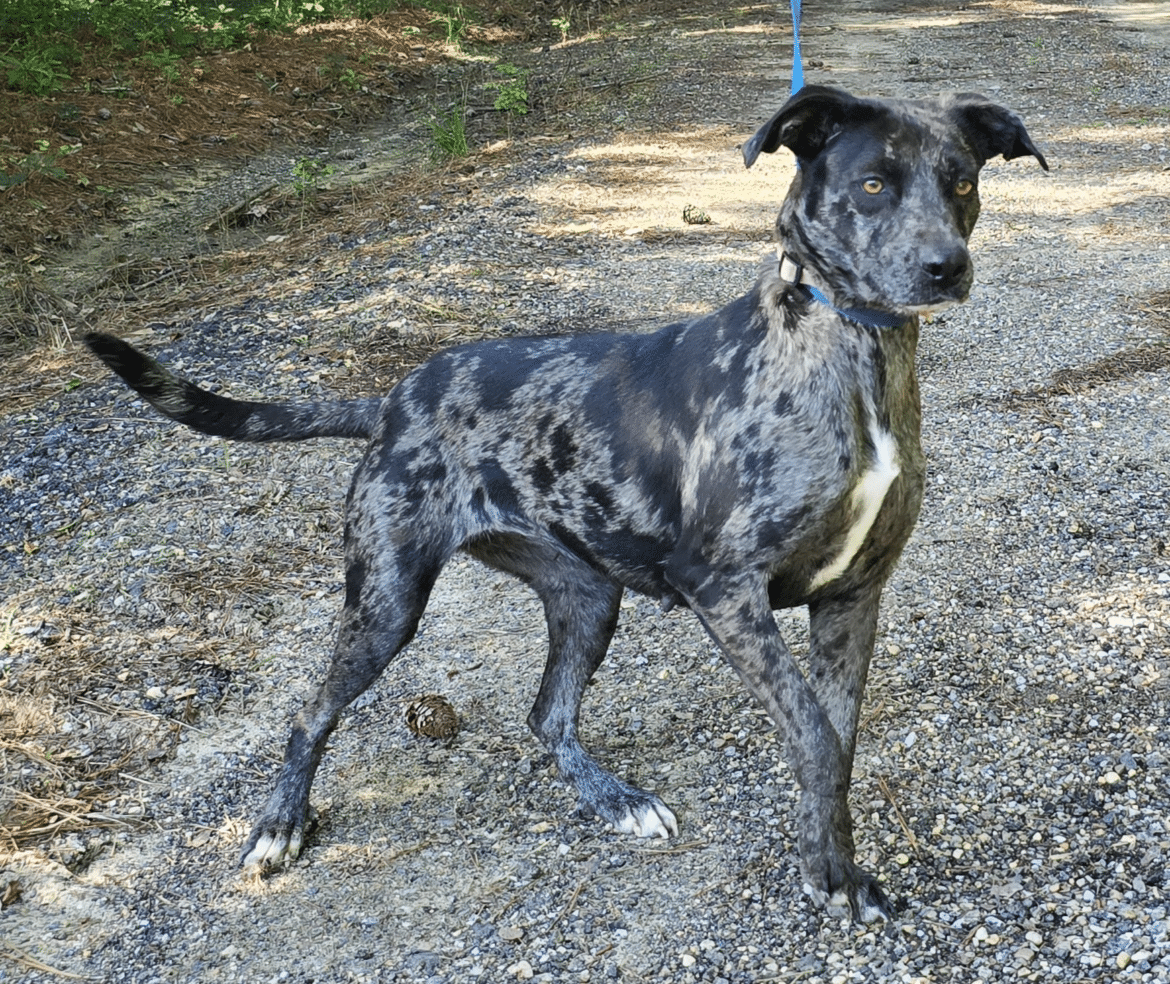 Arrow is a three-year old female Catahoula looking mix, 40 lbs with the best smile! She is a bit shy at first but warms up quickly and loves head scratches. She was positive for heartworms when she came to us but completed her treatment in August and is good to go. Of course keeping her on monthly prevention is an absolute so she never gets them again. Arrow is great with other dogs, loves everyone.