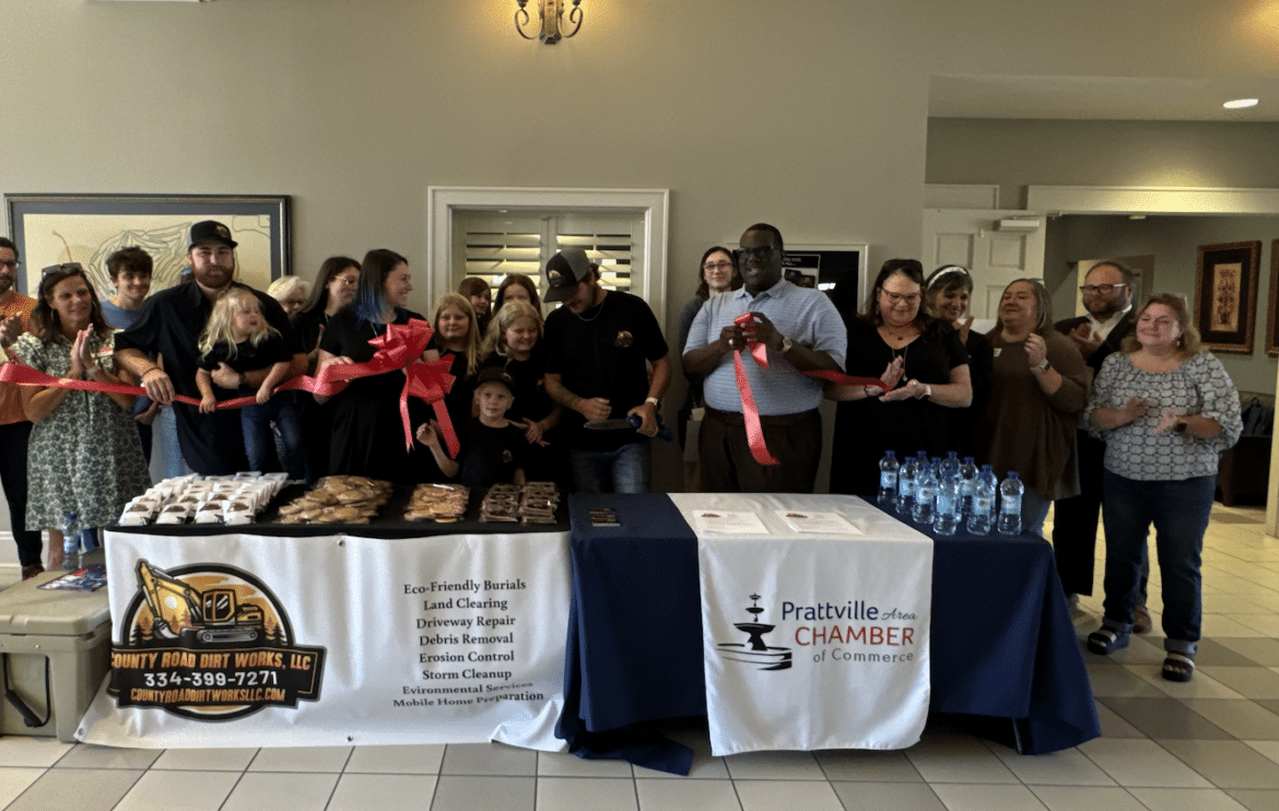 Today, County Road Dirt Works, LLC marked a significant milestone with a ribbon-cutting ceremony at the Prattville Area Chamber of Commerce. The event, attended by local community members and Chamber representatives, included a warm reception featuring cookies and homemade banana nut bread.
