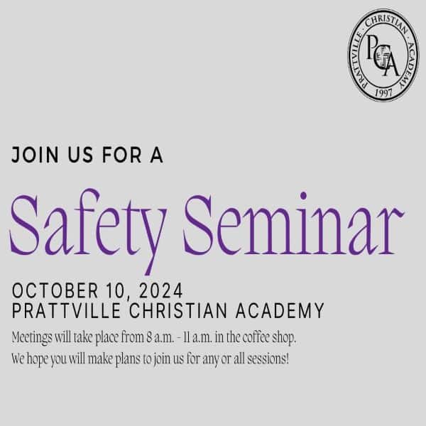 Join us for a safety seminar featuring speakers from the Prattville Police Department, PCA’s Safety Director, PCA’s Middle School Principal and the National Alliance on Mental Health.