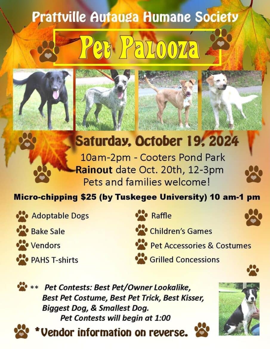 The Prattville/Autauga Humane Society’s annual Pet Palooza will be Saturday, Oct. 19th from 10-2, at Cooters Pond Park. (Rain out date–Oct. 20th, 12-3.)