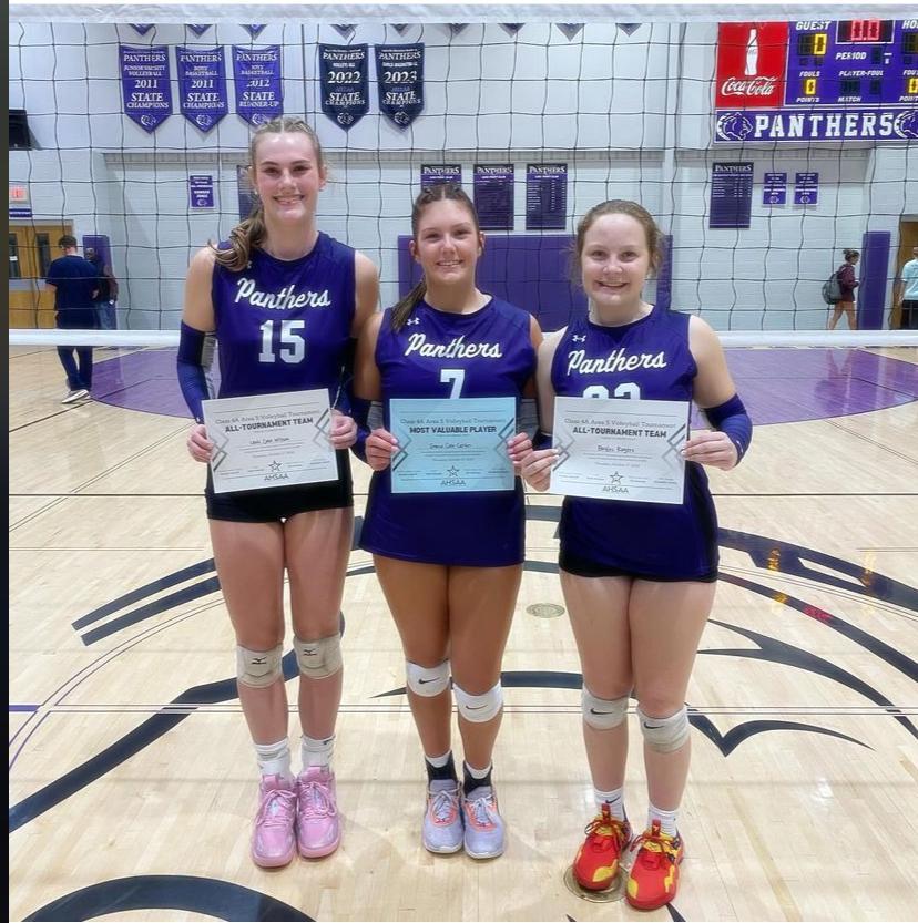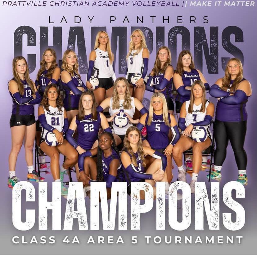 The Prattville Christian Academy Volleyball team won the Class 4A Area 5 Tournament on Thursday night with wins on Booker T. Washington (25-2, 25-6, 25-9) in the semi-finals and LAMP (25-10, 25-10, 25-19) in the championship match. The Panthers, ranked #1 in Class 4A, improve to 38-14 on the season.