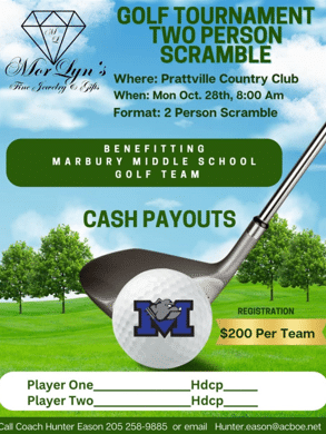 To support the team, Marbury Middle will be hosting a fundraiser tournament at Prattville Country Club on October 28. The tournament will be a 2-man scramble format, with registration at $200 per team. The event will begin at 8:00 AM, with an opportunity for businesses and individuals to sponsor a hole for $100 each. All proceeds from the tournament will go toward covering costs for the players in the upcoming season.