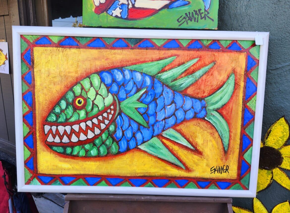 Sawyer’s most notable work is the Hollywood Fish. It almost always had a yellow background, with a fish wearing sunglasses and smiling. Many of his works also incorporated aspects of his life that he loved. For example, many of his paintings contained a cross or a church.