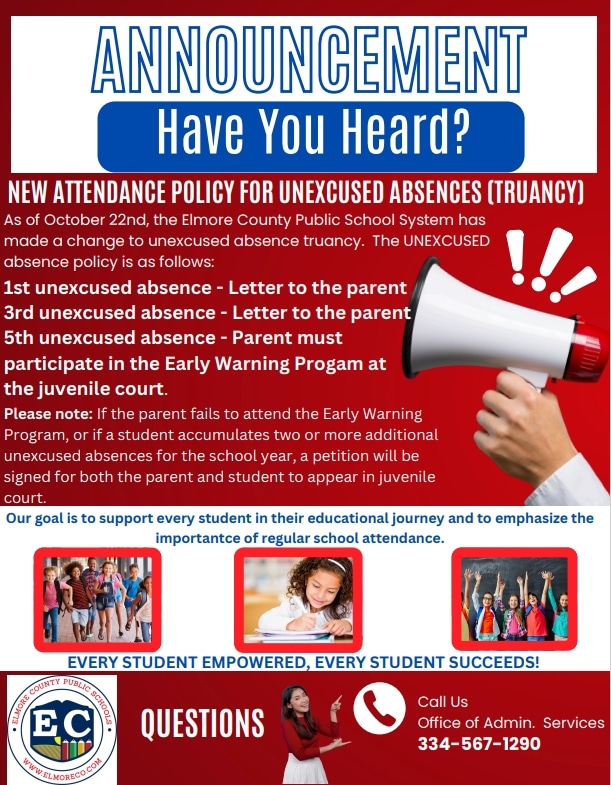 As of October 22, Elmore County Public Schools have implemented a new attendance policy to address unexcused absences and truancy, underscoring the importance of consistent school attendance. The revised policy aims to keep parents informed while offering structured interventions to support students in maintaining regular attendance.