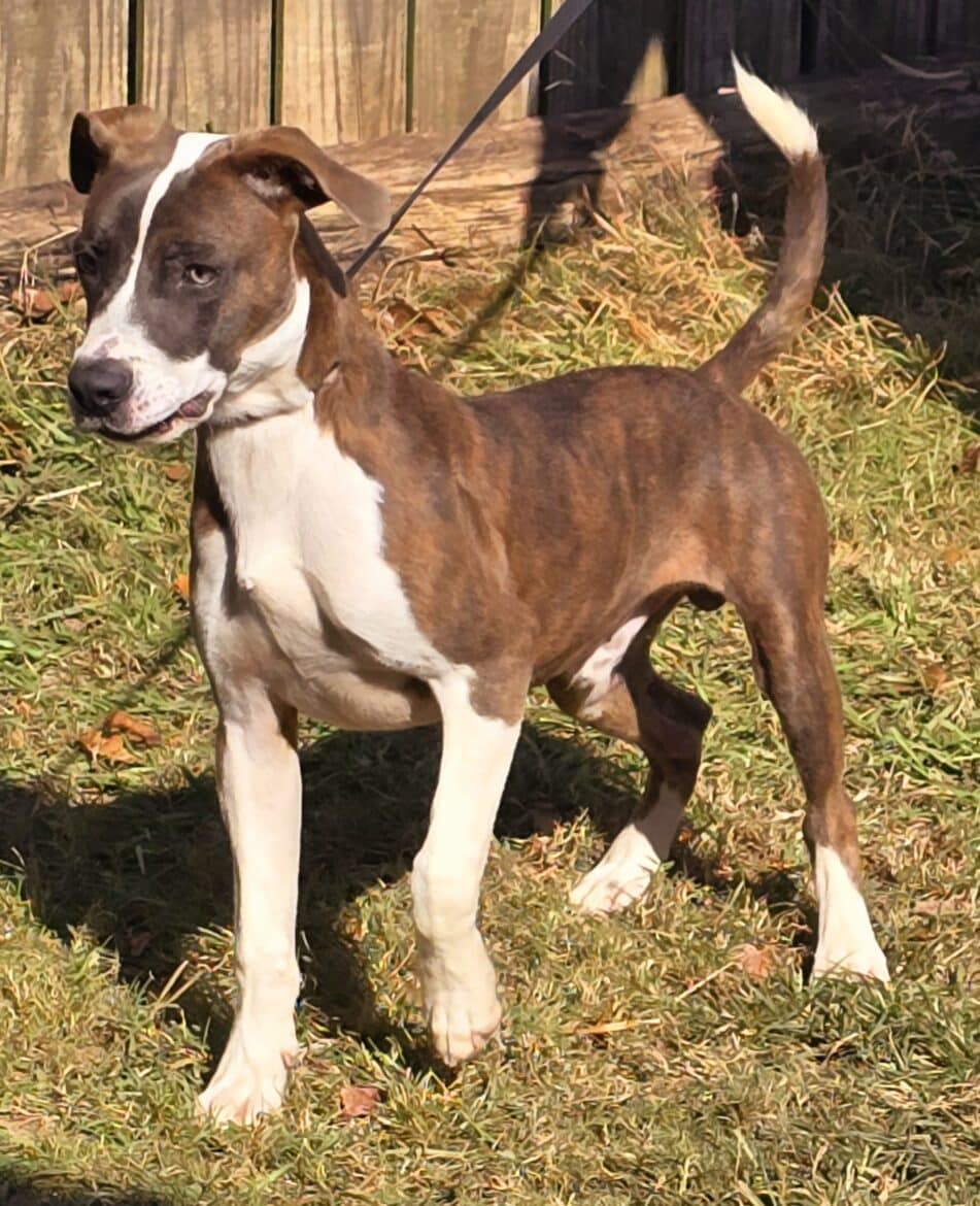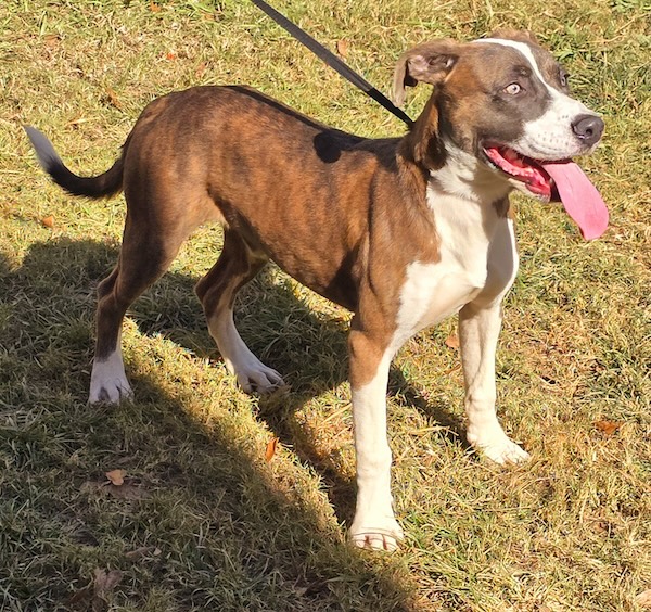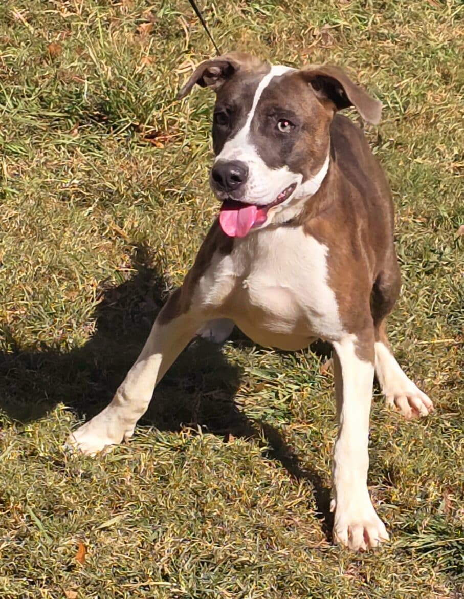 Beetlejuice is an eight-month-old male Pit mix, only about 35 lbs. He is a handsome blue-brindle with white. Sweet boy, good with dogs and cats, fast learner but short attention span. Responds well to corrections, loves playing fetch and can catch balls in the air.