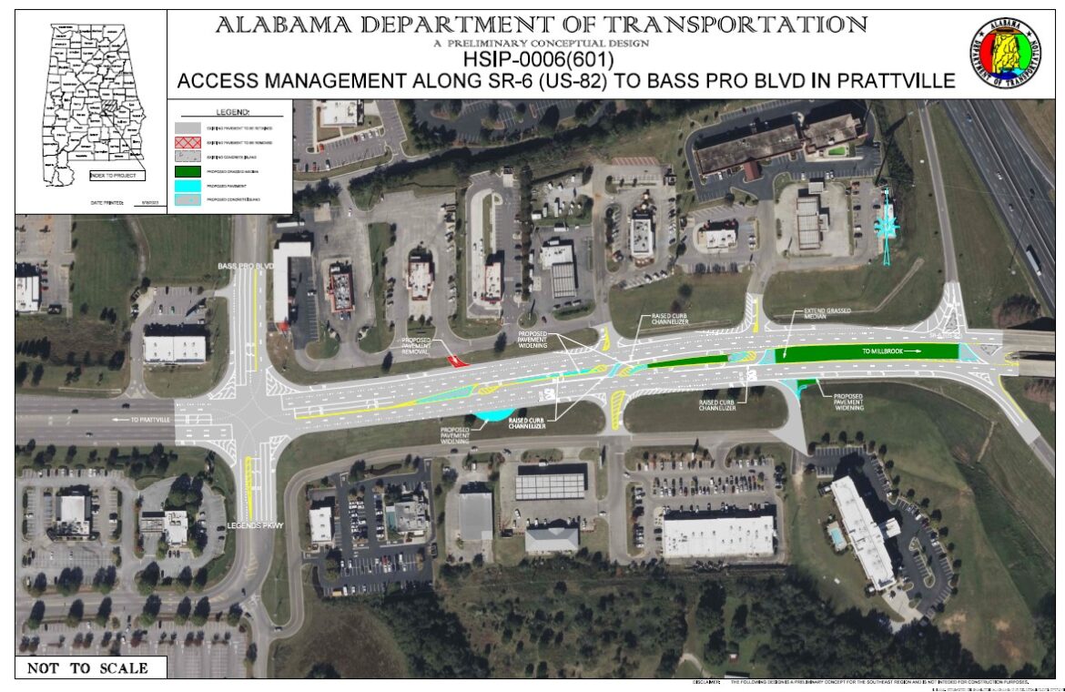 The Alabama Department of Transportation (ALDOT) is implementing an access management project along Cobbs Ford Road, between Bass Pro Boulevard and the southbound entrance ramp to Interstate 65.