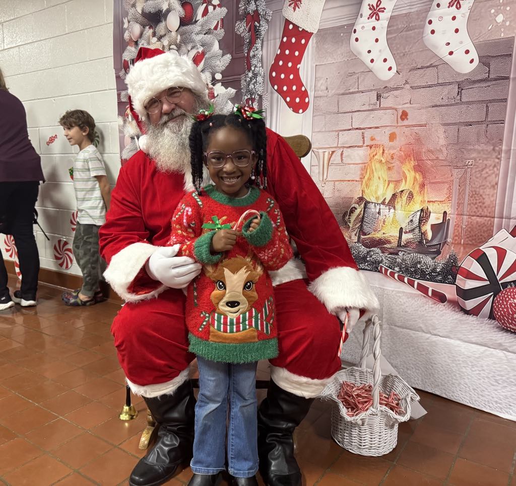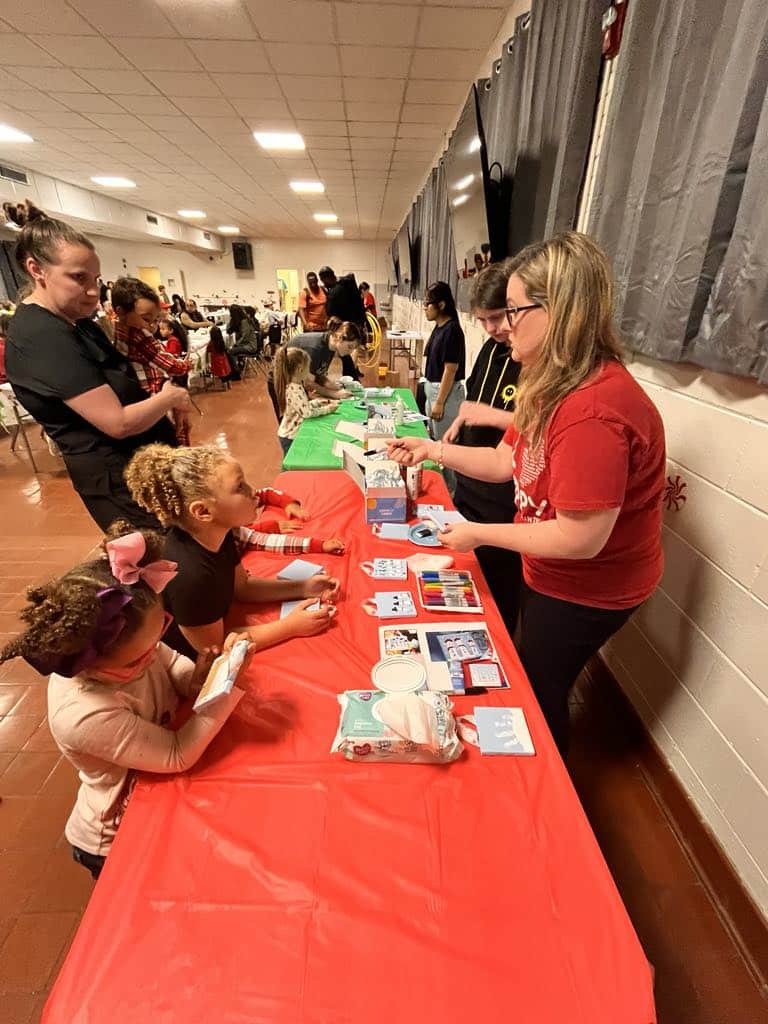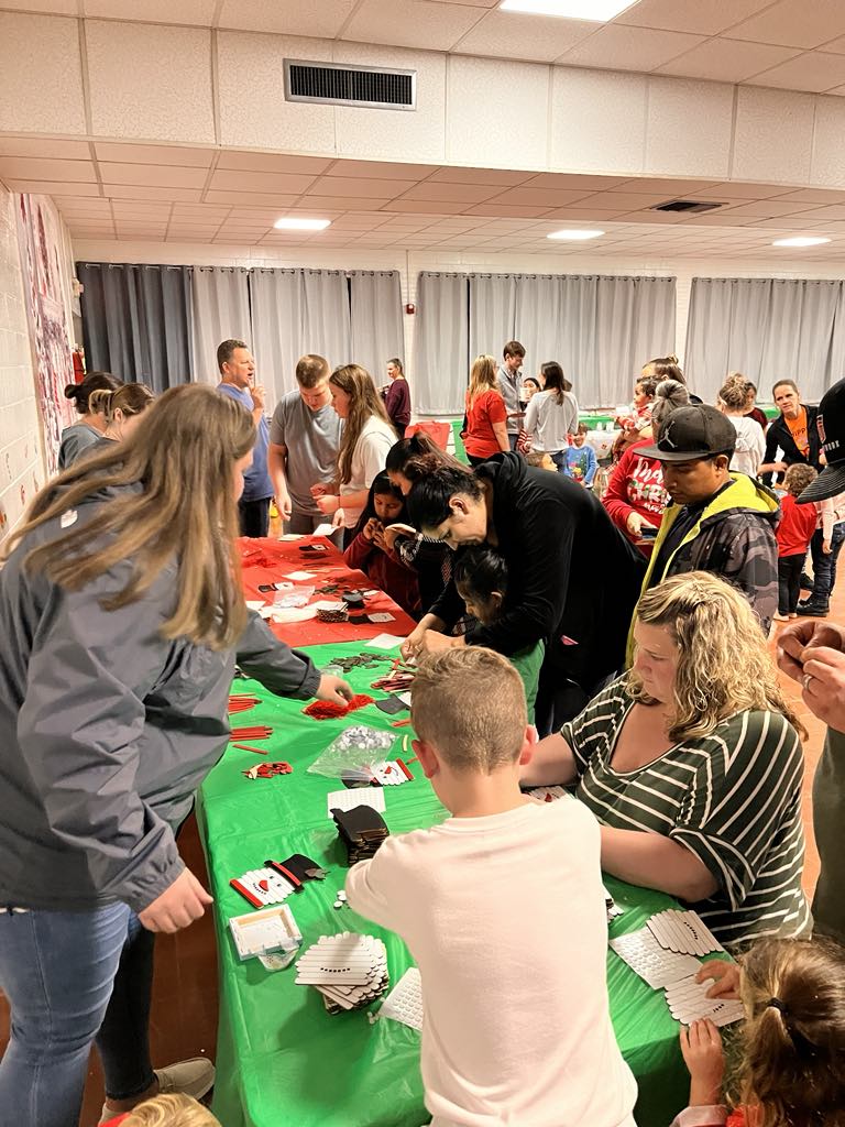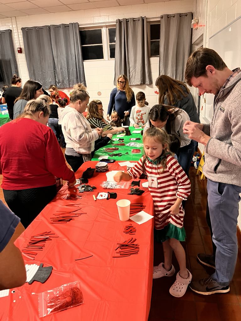 After dinner, the families were able to visit with Santa Claus and get a picture with him, story-time with Christmas cookies for the children, and crafts for the children as well as the adults. Crafts included a finger snowman canvas for the kids, and a wooden snowman ornament for adults.
