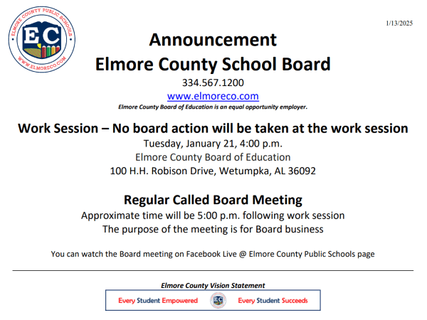 At 5 p.m. a regular board meeting will be held. You can watch the board meeting on Facebook Live @ Elmore County Public Schools page.