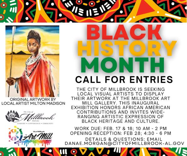 The City of Millbrook is seeking local visual artists to display their artwork to celebrate Black History Month at the Millbrook Art Mill Gallery, 3560 Grandview Road, Millbrook, AL. 36054. This inaugural exhibition honors African American contributions and invites wide-ranging artistic expression of Black heritage and culture.
