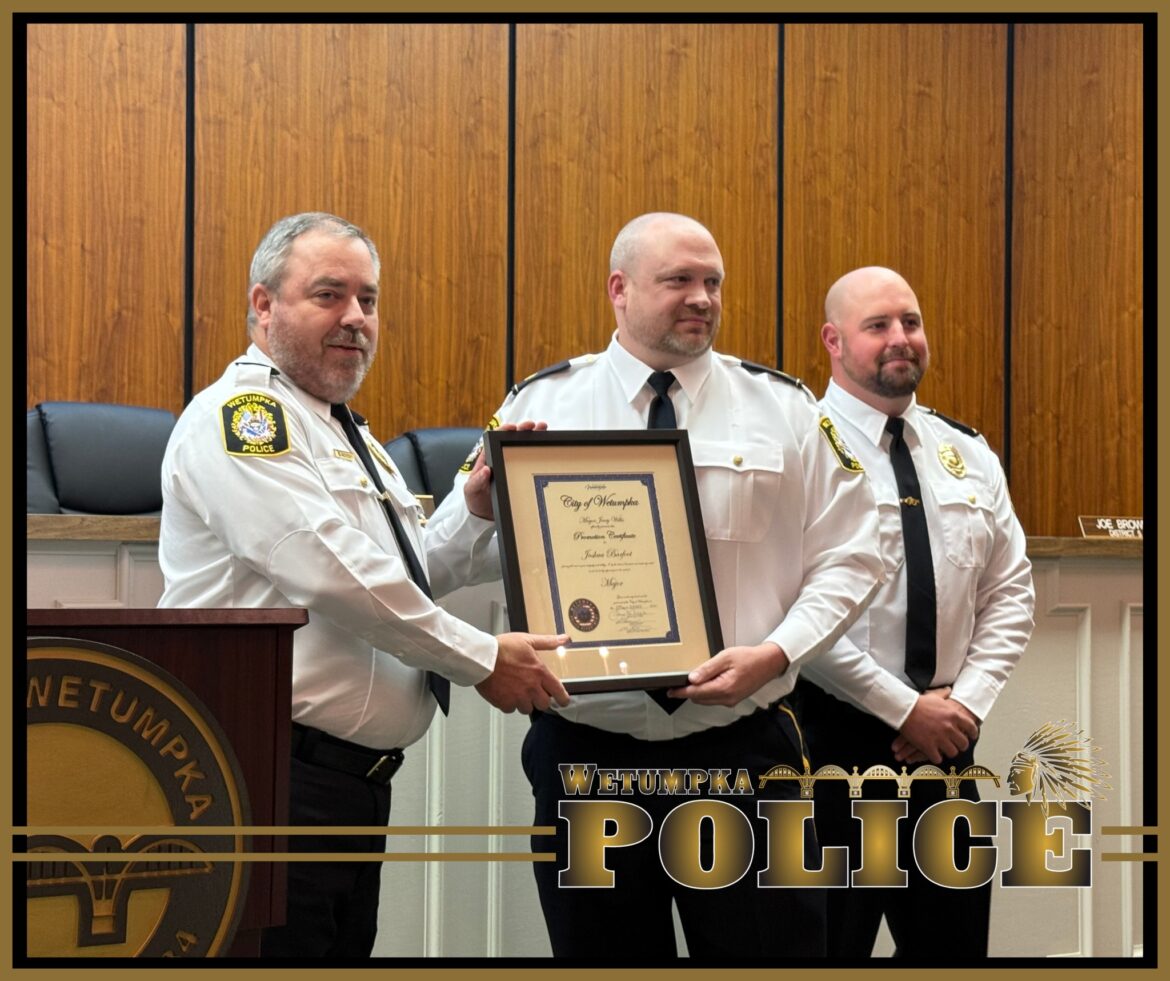 Last week, the Wetumpka Police Department celebrated the promotions of three exceptional officers during a special ceremony. Police Chief Ed Reeves proudly presented the promotions, joined by Assistant Police Chief Nick Betts and Mayor Jerry Willis.