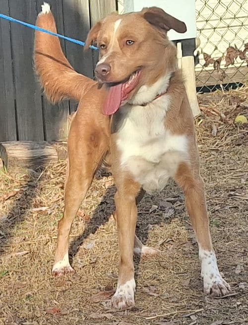 Bentley is a three-year-old male possibly Retriever type mix, about 70 lbs. Handsome fella, nice as can be, big goofball and can be a lot of dog at first but does settle down with exercise. Good with female dogs, have not yet checked with male dogs. Found as a stray never reclaimed.