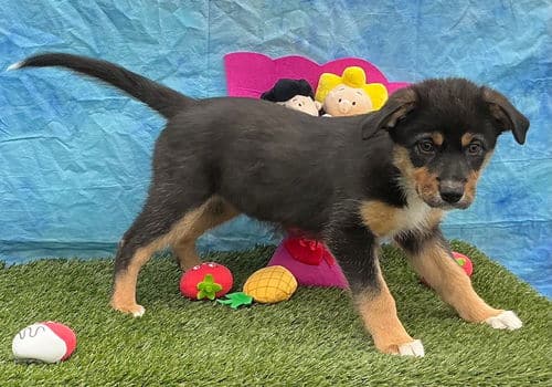 Zayda is a three-month-old female Aussie/Rottie/maybe Heeler mix, surrendered to us when their other dog did not like her. She has that herding/nipping instinct like Heelers so perhaps best with children ten years or older as toddlers and their parents may not understand her nipping at their heels to herd them. Zayda should be in the 60-70 lb range when fully grown and her foster mom reports that “Zayda is very smart happy playful puppy.. absolutely loves the water! And quite the cuddle bug! Knows the doggy door!”