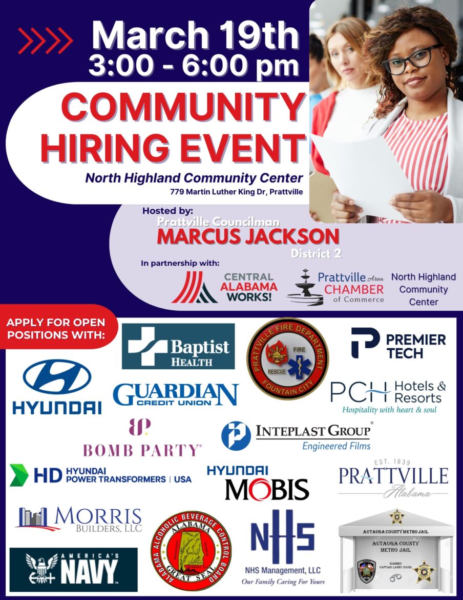 Looking for your next career opportunity? Join us for this Community Hiring Event hosted by Prattville City Councilor Marcus Jackson, in partnership with Central Alabama Works!, the Prattville Area Chamber of Commerce, and the North Highland Community Center.