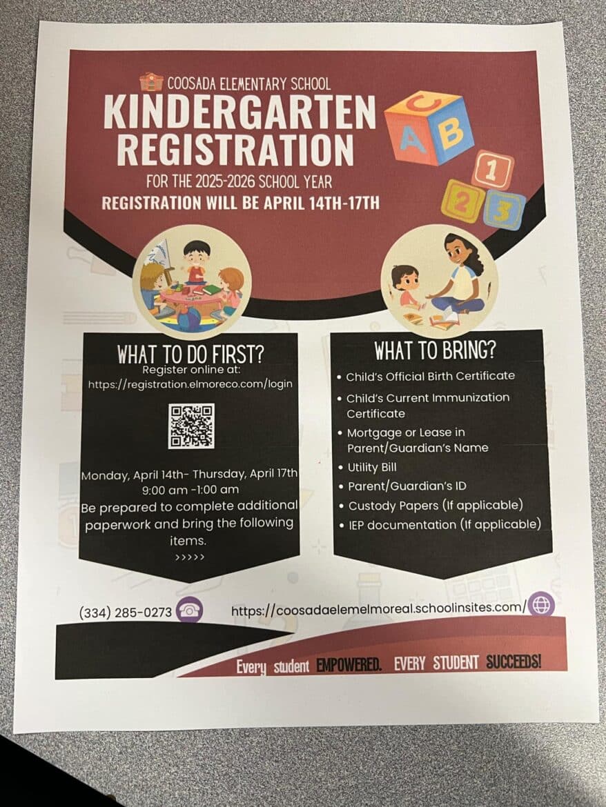 If you have a child who will begin kindergarten next school year at Coosada Elementary, registration opens April 14-17.