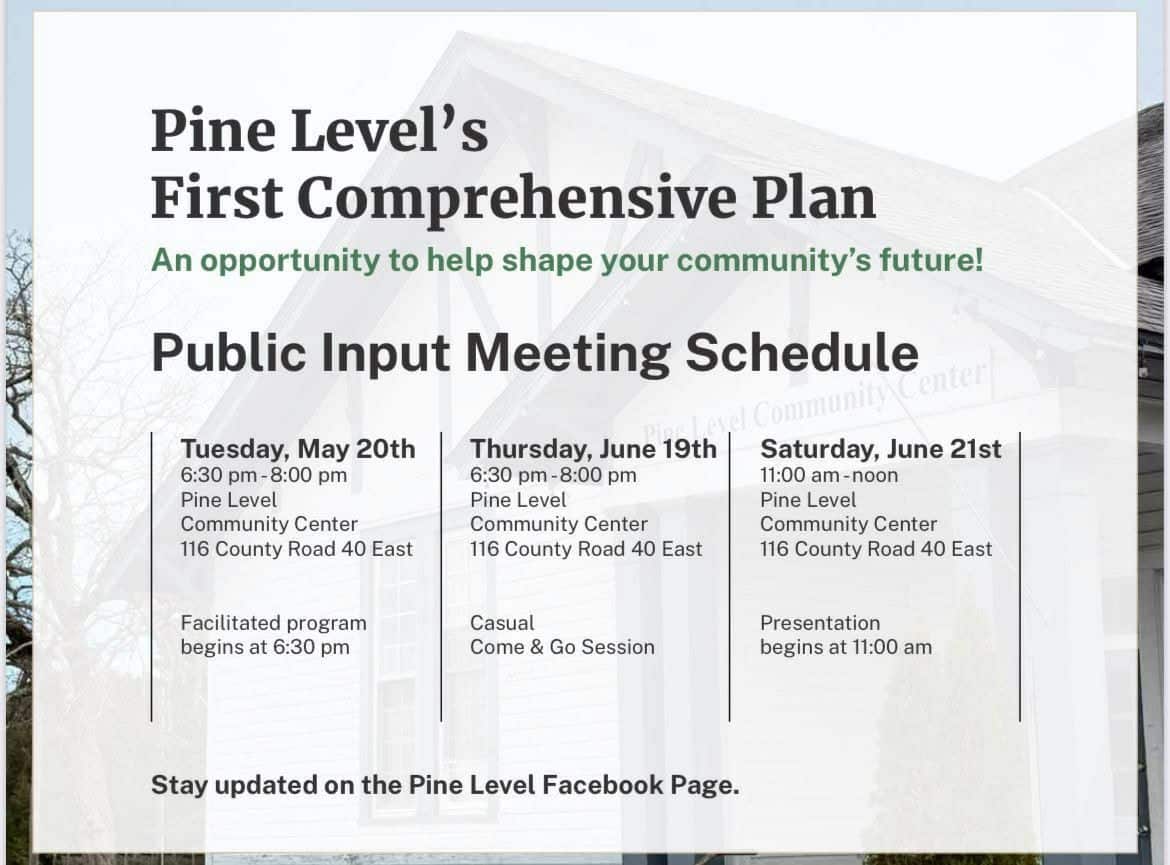 Pine Level has created its first Comprehensive Plan, which officials will share at upcoming public meetings for input from residents. This is an opportunity for residents to have a say in the future of the new town.