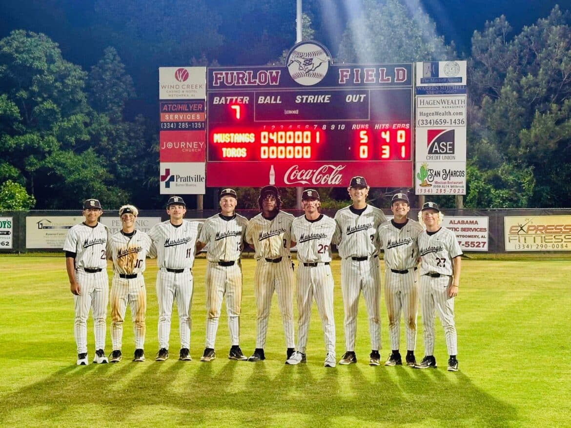 The Mustangs scored four runs in the top half of the 2nd inning. With bases loaded and two outs, the Toros walked Boswell, bringing in a run. The next batter, Jackson Stallworth, hit a double that drove in three runs.