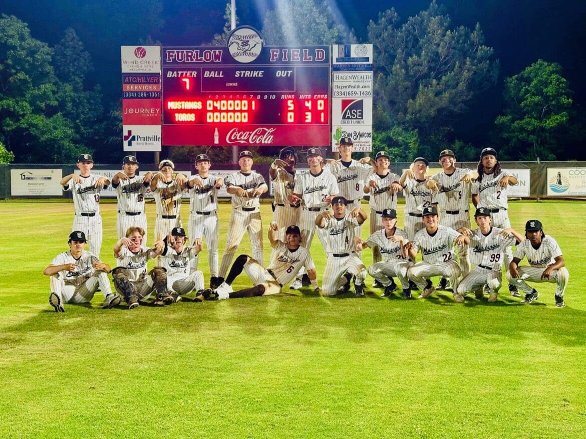 In Game 1, the Mustangs trailed 4-3 headed into the bottom of the 7th inning. Catcher Mack Boswell, who had a big hit in the 7th inning of Game 1 the week before against Helena, led off the 7th inning of Game 1 against Spanish Fort with a double.