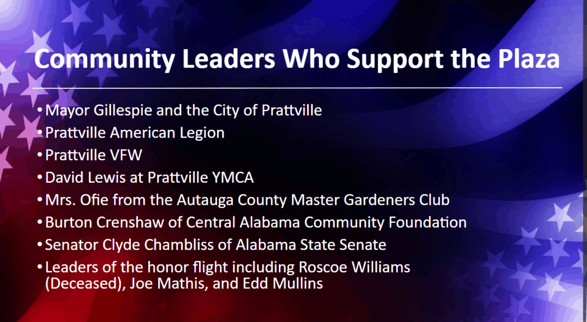 “Prattville has a lot of veterans and many military families. So, I did a lot of research and found other areas that have done it very well,” he said. “Back in 2018, I pitched the idea to the Autauga County Commission. They said they were interested but wanted to see more plans.”