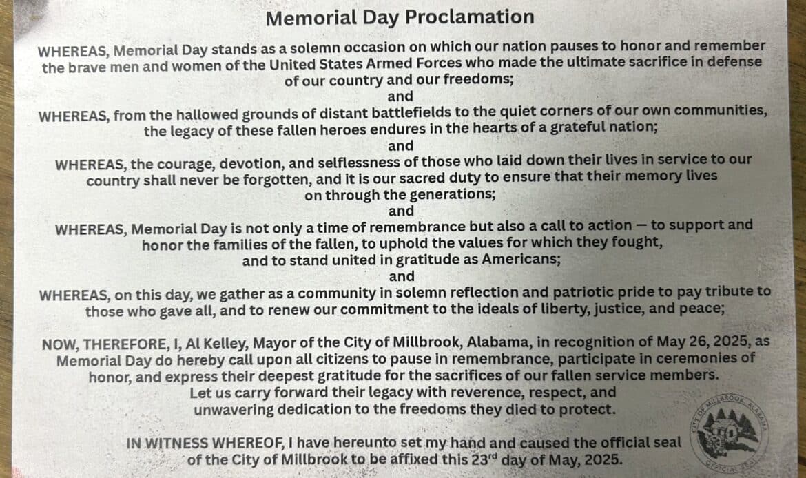 In a beautiful and honoring ceremony, the City of Millbrook and The Millbrook Area Chamber of Commerce hosted a well-attended Memorial Day Observance this morning.