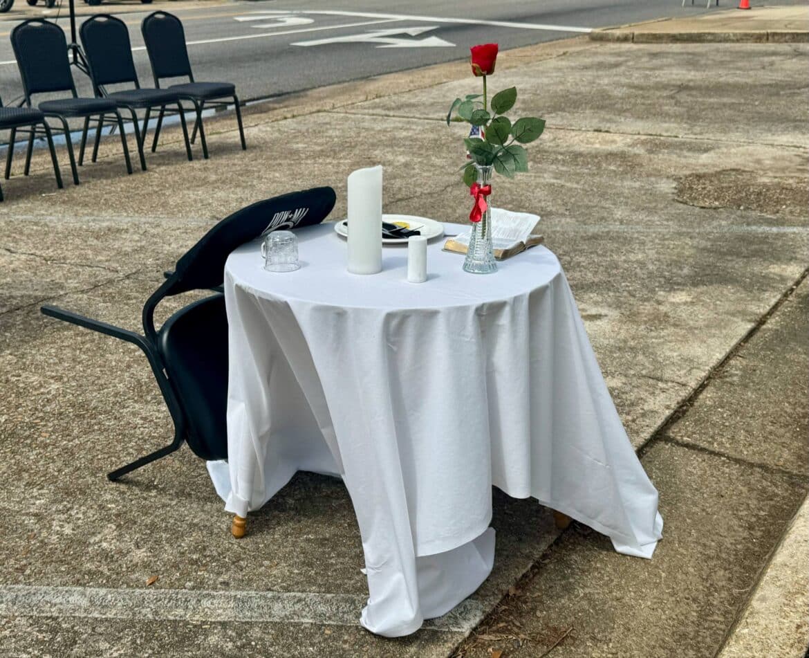 The table was adorned with a white cloth, symbolic of the purity of their intentions. A single rose in a vase signifies the blood they may have shed in their sacrifice to ensure freedom.