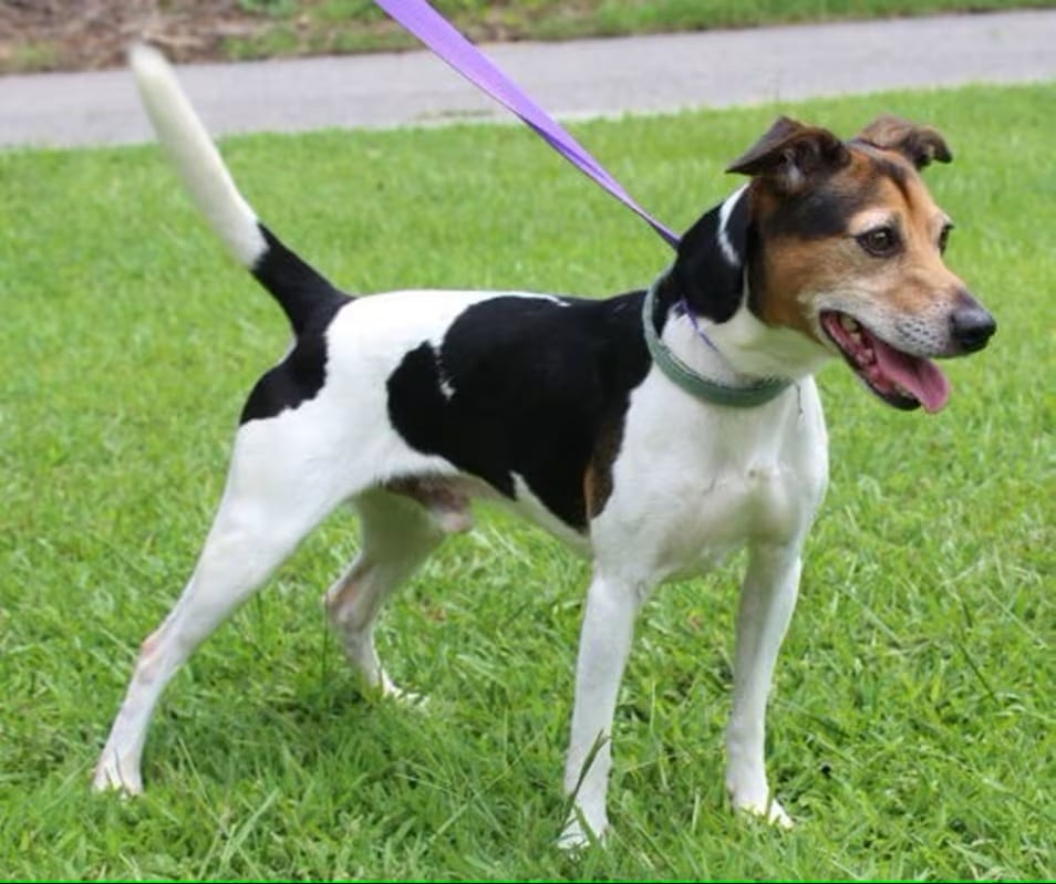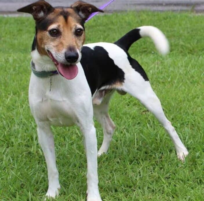 Ace is a 2-year-old Jack Russell Terrier mix who must be neutered before adoption. He is an owner turn in because his owner can no longer take care of him. Ace’s short coat is white with a good bit of black markings; and he also has some brown markings. He weighs 23 pounds so he is a fairly small dog. Ace is active and playful–all Jack Russells are! He is smart as can be–already knows the commands ‘sit, spin, down, and speak’. Ace loves playing fetch; and thoroughly enjoys swimming and floating in the pool! He is leash trained and house trained. His former owner has shared that Ace is a ‘super snuggler’; who will sleep in the bed with his human! Ace loves cats and will snuggle up with them for a nap! This guy would be just fine with children, other dogs, and cats. Ace is a great dog who is going to make some lucky adopter an incredibly sweet and SMART new friend.