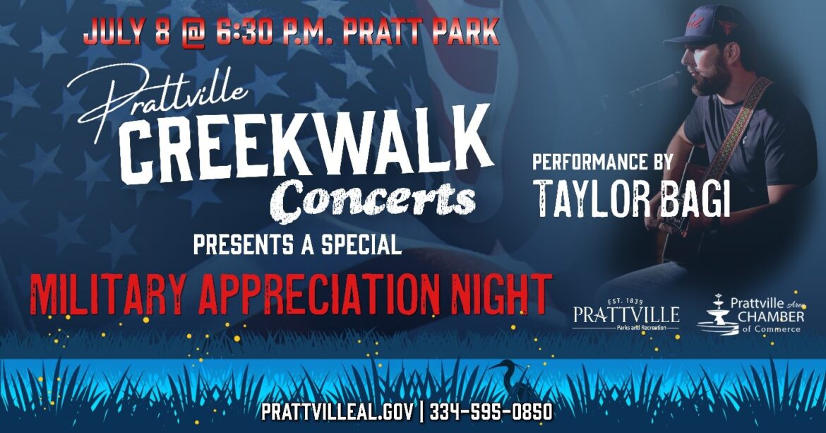 The City of Prattville and the Prattville Area Chamber of Commerce are proud to honor local service members and veterans with a special Military Appreciation Night during the Creekwalk Concert Series on Tuesday, July 8, 2025, at 6:30 PM at Pratt Park (456 Doster Road, Prattville, AL).