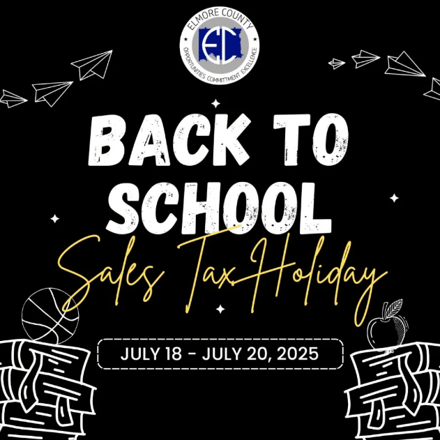 The Elmore County Commission is pleased to announce continued participation in the Annual Back-to-School Sales Tax Holiday beginning Friday, July 18, 2025 at 12:01am (CST) ending at midnight on Sunday, July 20, 2025. On April 27, 2017, the Commission approved a Resolution authorizing participation in the Sales Tax Holiday (authorized by Act No. 2017-120) and each year after beginning at 12:01am on the third Friday in July and ending at twelve midnight on the third Sunday in July.