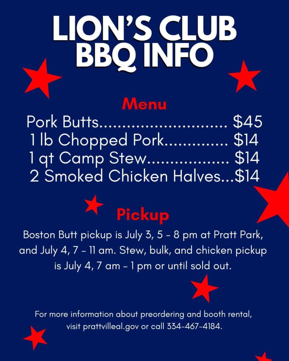 The annual Prattville Lions Club BBQ sale is coming Friday to Pratt Park! They will join other vendors for a day of celebrating Independence Day! EAN’s Bob Ealum went to visit this evening as the crew was cooking and doing advance preparations. It was hot work, but a big fan helped to keep the air moving. See graphic for pricing information.